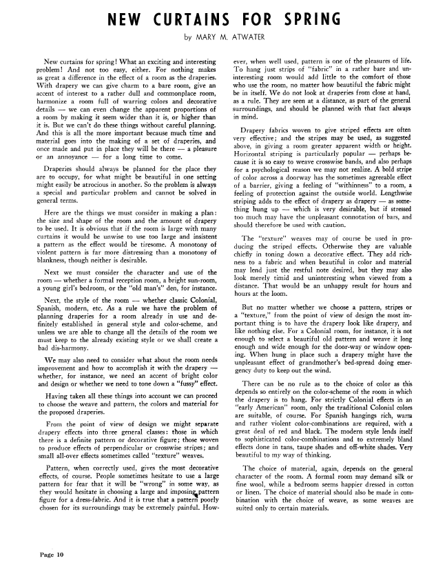 New Curtains for Spring, Atwater, Mary M. Weaver, Vol. 5 No. 4 (October-November 1940), 5 pages. Note: PDF provided by Judith Combs. Posted September 2, 2006. SAMPLE PAGE. File size 497 KB PDF