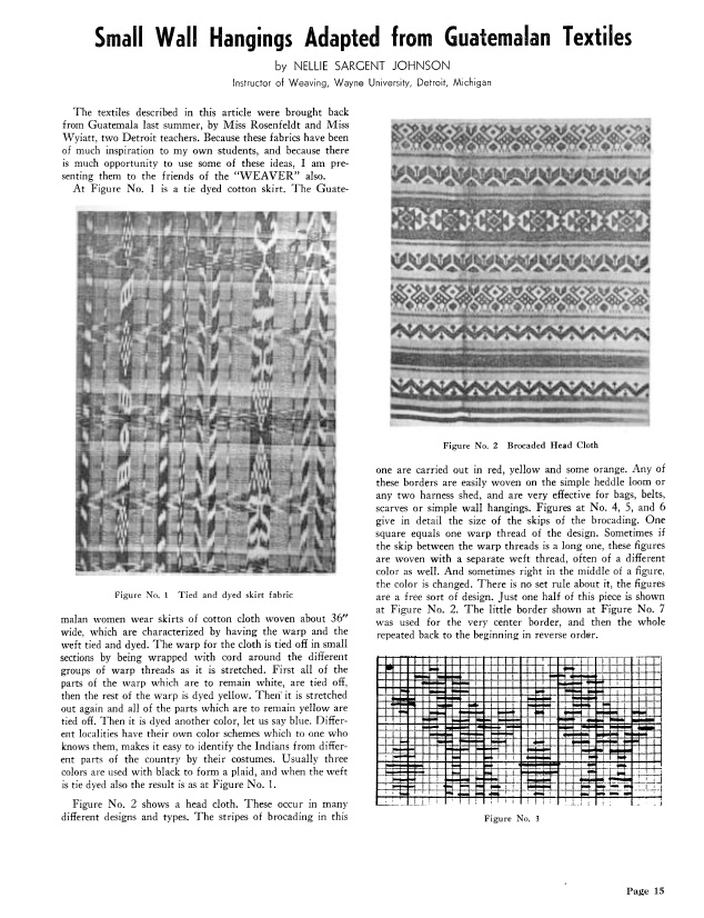 Small Wall Hangings Adapted from Guatemalan Textiles, Johnson, Nellie Sargent. Weaver, Vol. 5 No. 4 (October-November 1940), 3 pages. Note: PDF provided by Judith Combs. Posted September 2, 2006. SAMPLE PAGE. File size 327 KB PDF