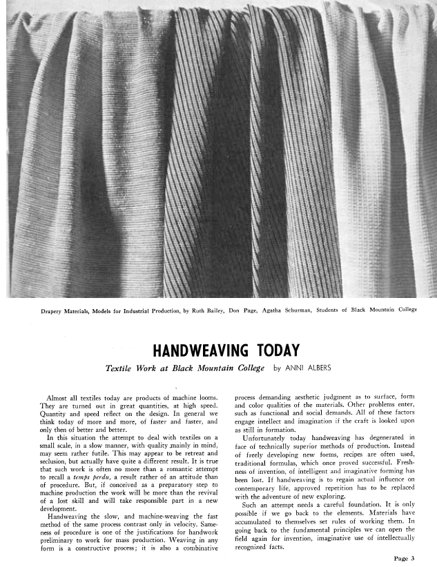 Handweaving Today, Textile Work at Black Mountain College, Albers, Anni. Weaver, Vol. 6 No. 1 (January-February 1941), 5 pages. Note: PDF provided by Judith Combs. Posted September 2, 2006. SAMPLE PAGE. File size 443 KB PDF