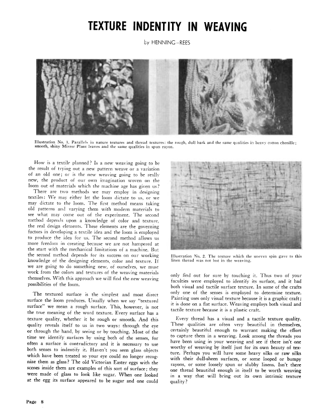 Texture Identity in Weaving, Rees, Henning. Weaver, Vol. 6 No. 1 (January-February 1941), 2 pages. Note: PDF provided by Judith Combs. Posted September 2, 2006. SAMPLE PAGE. File size 222 KB PDF