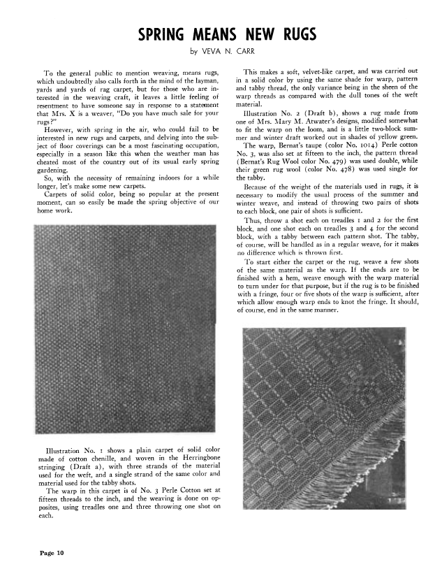 Spring Means New Rugs, Carr, Veva N. Weaver, Vol. 6 No. 1 (January-February 1941), 2 pages. Note: PDF provided by Judith Combs. Posted September 2, 2006. SAMPLE PAGE. File size 197 KB PDF