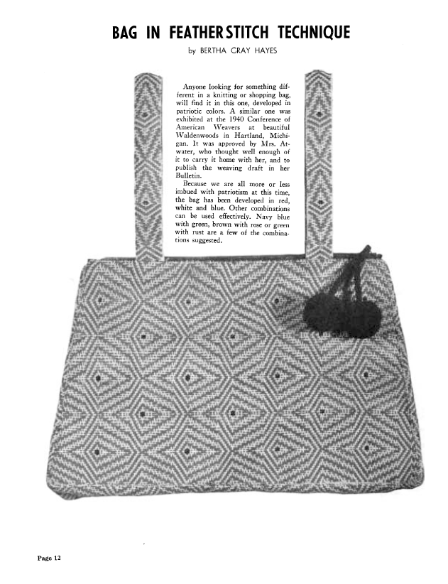Bag in Featherstitch Technique, Hayes, Bertha Gray. Weaver, Vol. 6 No. 1 (January-February 1941), 3 pages. Note: PDF provided by Judith Combs. Posted September 2, 2006. SAMPLE PAGE. File size 255 KB PDF