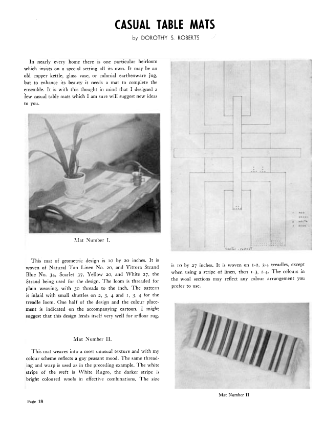 Casual Table Mats, Roberts, Dorothy S. Weaver, Vol. 6 No. 1 (January-February 1941), 2 pages. Note: PDF provided by Judith Combs. Posted September 2, 2006. SAMPLE PAGE. File size 131 KB PDF