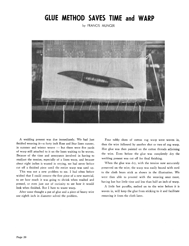 Glue Method Saves Time and Warp, Munger, Francis. Weaver, Vol. 6 No. 1 (January-February 1941), 1 page. Note: PDF provided by Judith Combs. Posted September 2, 2006. SAMPLE PAGE. File size 59 KB PDF