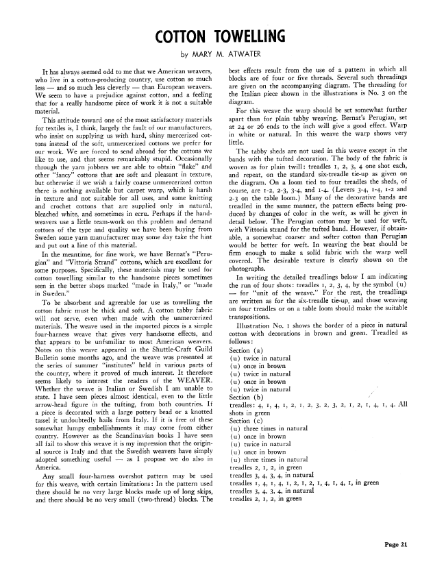 Cotton Towelling, Atwater, Mary M. Weaver, Vol. 6 No. 1 (January-February 1941), 5 pages. Note: PDF provided by Judith Combs. Posted September 2, 2006. SAMPLE PAGE. File size 442 KB PDF