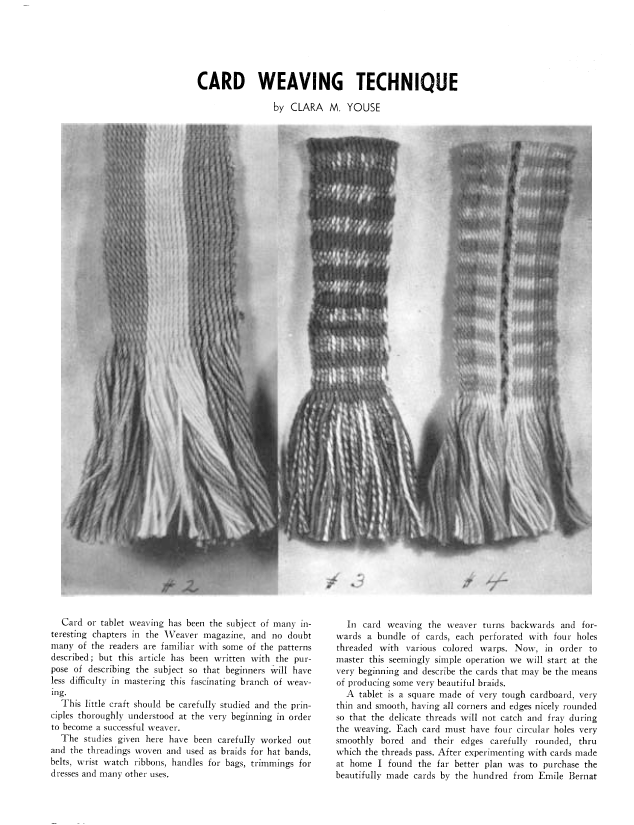Card Weaving Technique, Youse, Clara M. Weaver, Vol. 6 No. 1 (January-February 1941), 5 pages. Note: PDF provided by Judith Combs. Posted September 2, 2006. SAMPLE PAGE. File size 497 KB PDF