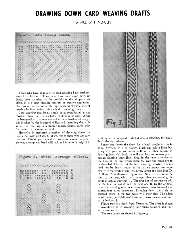 Drawing Down Card Weaving Drafts, McNulty, Mrs. W.F. Weaver, Vol. 6 No. 1 (January-February 1941), 1 page. Note: PDF provided by Judith Combs. Posted September 2, 2006. SAMPLE PAGE. File size 95 KB PDF