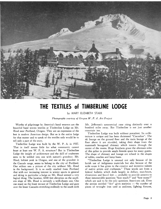 The Textiles of Timberline Lodge, Starr, Mary Elizabeth. Weaver, Vol. 6 No. 2 (April-May 1941), 6 pages. Note: PDF provided by Judith Combs. Posted September 2, 2006. SAMPLE PAGE. File size 386 KB PDF