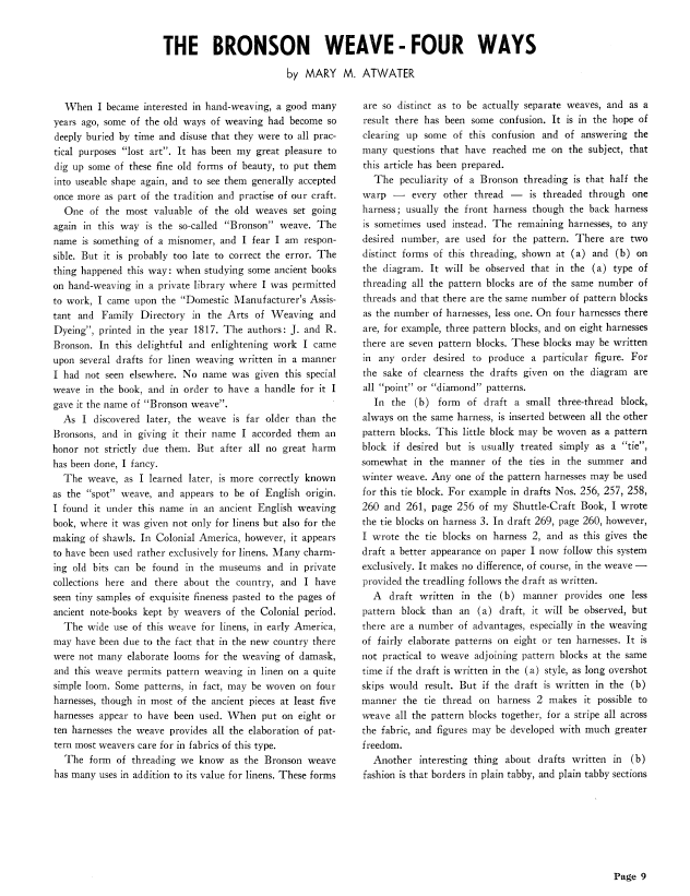 The Bronson Weave - Four Ways, Atwater, Mary M. Weaver, Vol. 6 No. 2 (April-May 1941), 9 pages. Note: PDF provided by Judith Combs. Posted September 2, 2006. SAMPLE PAGE. File size 835 KB PDF