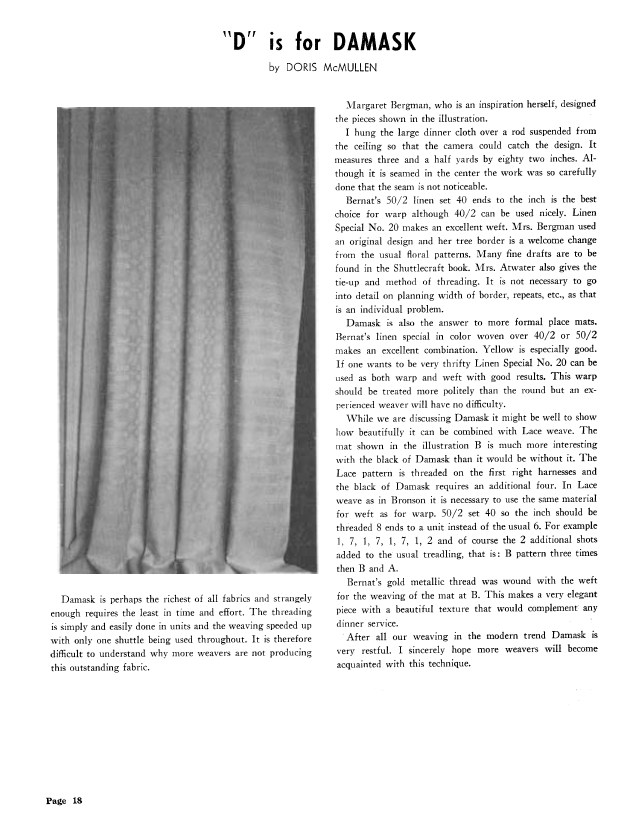 D is for Damask, McMullen, Doris. Weaver, Vol. 6 No. 2 (April-May 1941), 2 pages. Note: PDF provided by Judith Combs. Posted September 2, 2006. SAMPLE PAGE. File size 124 KB PDF