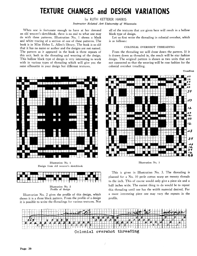 Texture Changes and Design Variations, Harris, Ruth Ketterer. Weaver, Vol. 6 No. 2 (April-May 1941), 5 pages. Note: PDF provided by Judith Combs. Posted September 2, 2006. SAMPLE PAGE. File size 458 KB PDF