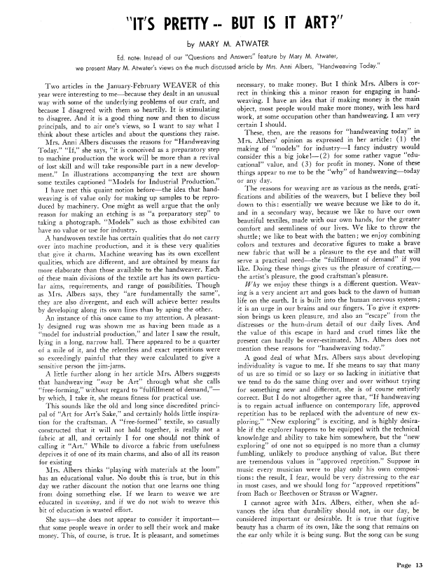 It's Pretty - But is it Art?, Atwater, Mary M. Weaver, Vol. 6 No. 3 (July-August 1941), 3 pages. Note: PDF provided by Judith Combs. Posted September 2, 2006. SAMPLE PAGE. File size 439 KB PDF