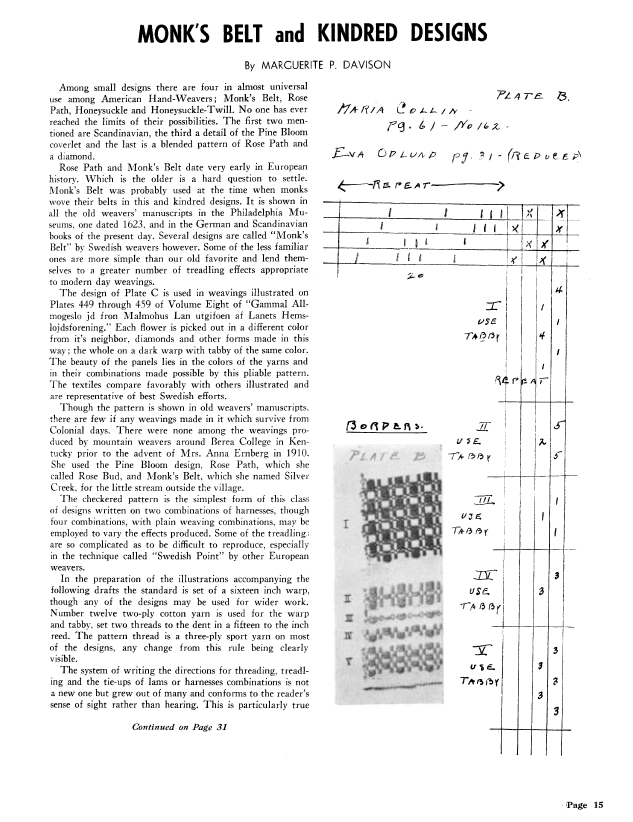 Monk's Belt and Kindred Designs, Davison, Marguerite. Weaver, Vol. 6 No. 3 (July-August 1941), 11 pages. Note: PDF provided by Judith Combs. Posted September 2, 2006. SAMPLE PAGE. File size 742 KB PDF