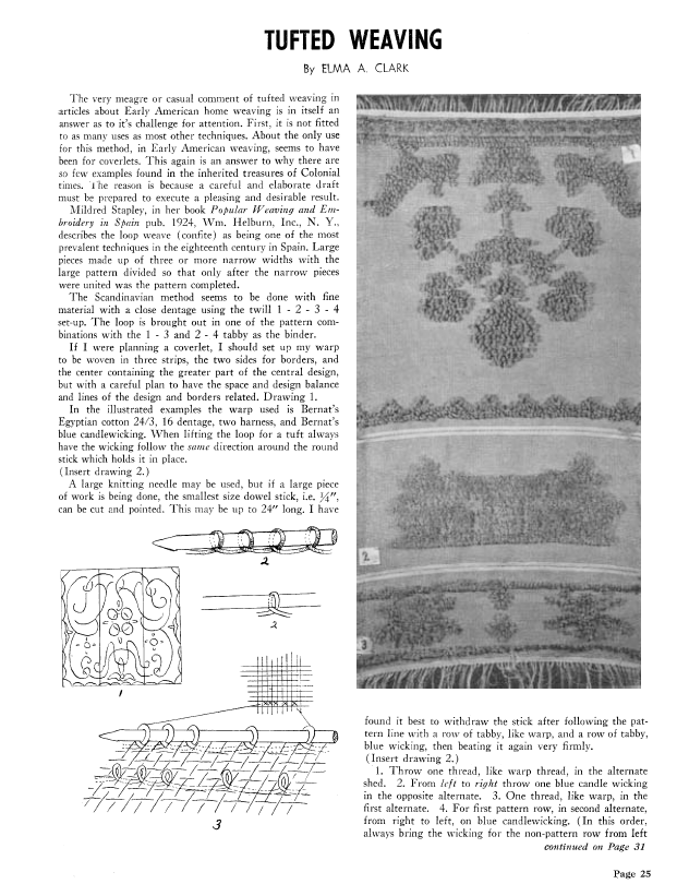 Tufted Weaving, Clark, Elma A. Weaver, Vol. 6 No. 3 (July-August 1941), 2 pages. Note: PDF provided by Judith Combs. Posted September 2, 2006. SAMPLE PAGE. File size 220 KB PDF