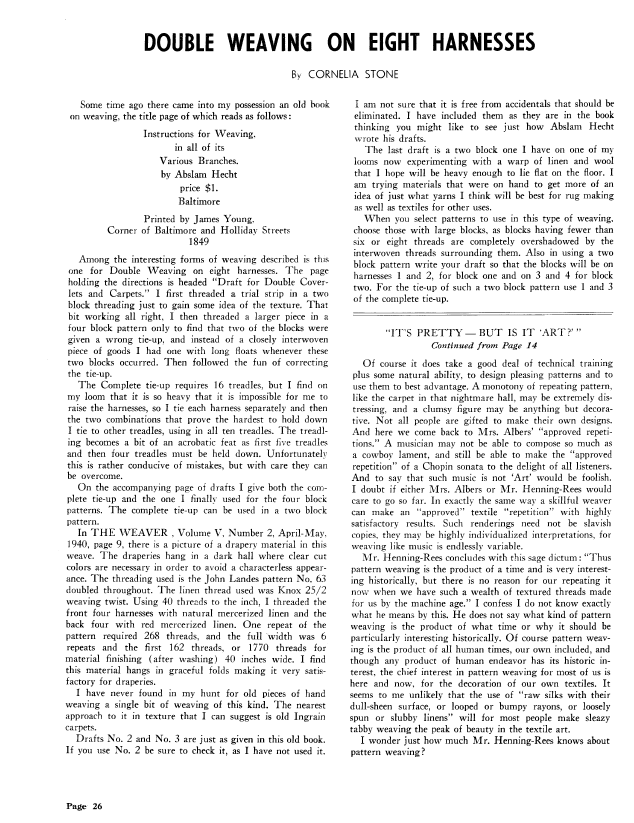 Double Weaving on Eight Harnesses, Stone, Cornelia. Weaver, Vol. 6 No. 3 (July-August 1941), 2 pages. Note: PDF provided by Judith Combs. Posted September 2, 2006. SAMPLE PAGE. File size 214 KB PDF