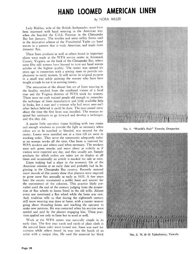 Hand Loomed American Linen, Miller, Nora. Weaver, Vol. 6 No. 3 (July-August 1941), 3 pages. Note: PDF provided by Judith Combs. Posted September 2, 2006. SAMPLE PAGE. File size 277 KB PDF