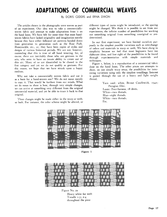 Adaptations of Commercial Weaves, Geddis, Doris and Erna Dixon. Weaver, Vol. 6 No. 4 (October-November 1941), 2 pages. Note: PDF provided by Judith Combs. Posted September 2, 2006. SAMPLE PAGE. File size 123 KB PDF