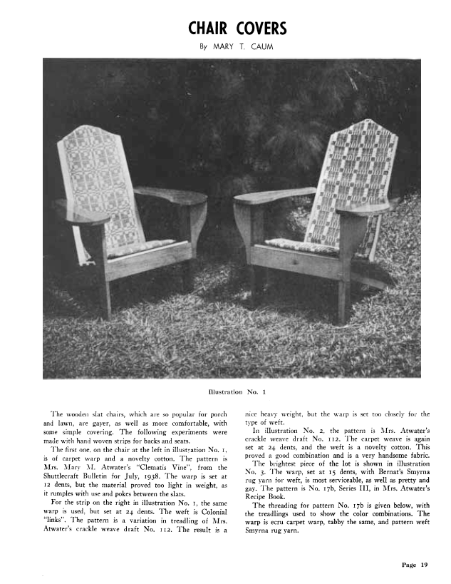 Chair Covers, Caum, Mary T. Weaver, Vol. 6 No. 4 (October-November 1941), 3 pages. Note: PDF provided by Judith Combs. Posted September 2, 2006. SAMPLE PAGE. File size 151 KB PDF