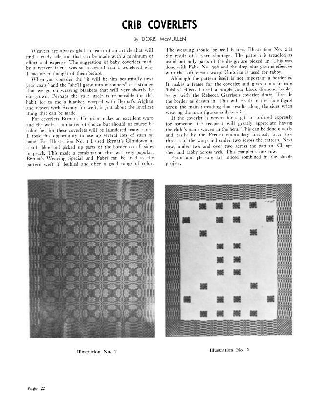 Crib Coverlets, McMullen, Doris. Weaver, Vol. 6 No. 4 (October-November 1941), 1 page. Note: PDF provided by Judith Combs. Posted September 2, 2006. SAMPLE PAGE. File size 90 KB PDF