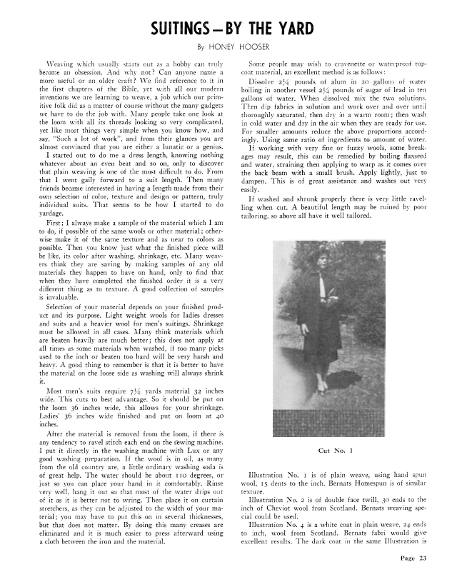 Suitings - By the Yard, Hooser, Honey. Weaver, Vol. 6 No. 4 (October-November 1941), 2 pages. Note: PDF provided by Judith Combs. Posted September 2, 2006. SAMPLE PAGE. File size 170 KB PDF