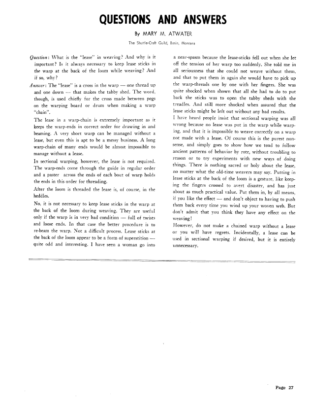 Questions and Answers - The Lease, Atwater, Mary M. Weaver, Vol. 6 No. 4 (October-November 1941), 1 page. Note: PDF provided by Judith Combs. Posted September 2, 2006. SAMPLE PAGE. File size 72 KB PDF