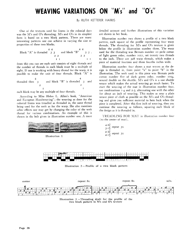 Weaving Variations on M's and O's, Harris, Ruth Ketterer. Weaver, Vol. 6 No. 4 (October-November 1941), 3 pages. Note: PDF provided by Judith Combs. Posted September 2, 2006. SAMPLE PAGE. File size 227 KB PDF