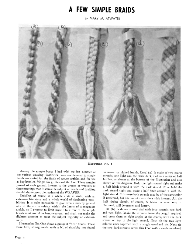 A Few Simple Braids, Atwater, Mary M. Weaver, Vol. 7 No. 1 (January-February 1942), 6 pages. Note: PDF provided by Judith Combs. Posted September 2, 2006. SAMPLE PAGE. File size 475 KB PDF