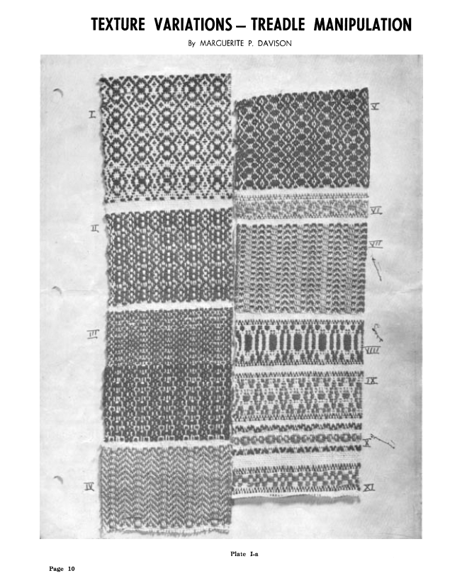 Texture Variations - Treadle Manipulation, Davison, Marguerite. Weaver, Vol. 7 No. 1 (January-February 1942), 10 pages. Note: PDF provided by Judith Combs. Posted September 2, 2006. SAMPLE PAGE. File size 627 KB PDF