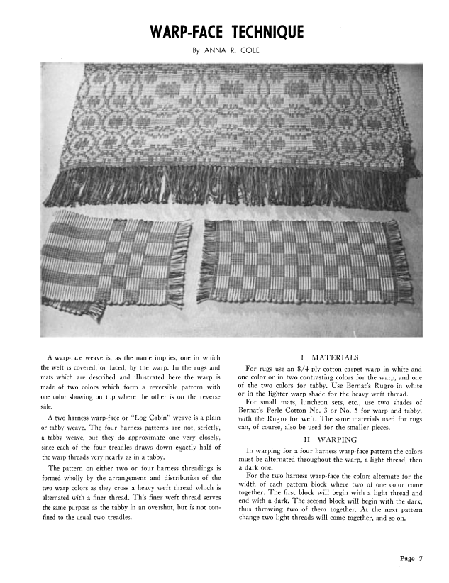 Warp-Face Technique, Cole, Anna R. Weaver, Vol. 7 No. 2 (July 1942), 3 pages. Note: PDF provided by Judith Combs. Posted September 2, 2006. SAMPLE PAGE. File size 243 KB PDF