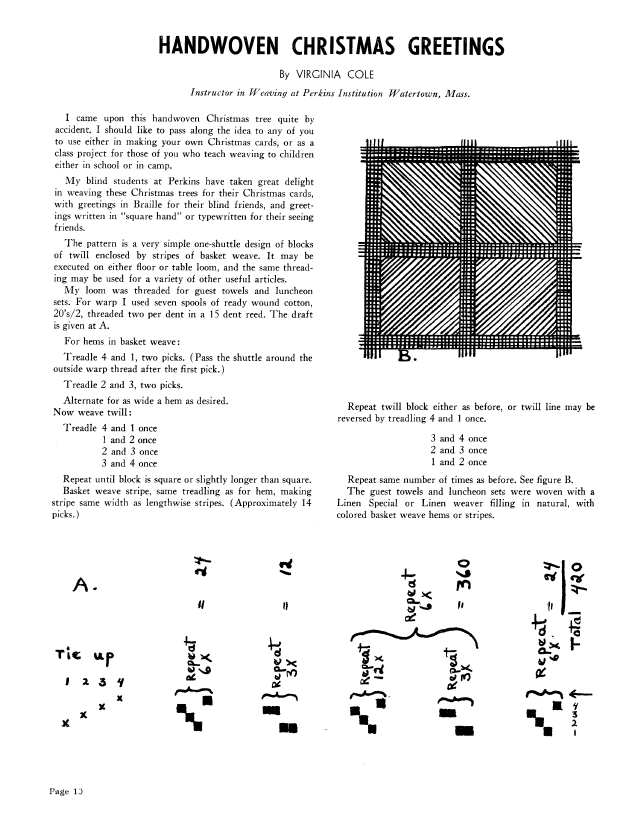 Handwoven Christmas Greetings, Cole, Virginia. Weaver, Vol. 7 No. 2 (July 1942), 2 pages. Note: PDF provided by Judith Combs. Posted September 2, 2006. SAMPLE PAGE. File size 152 KB PDF