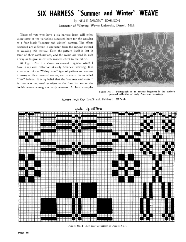Six Harness Summer and Winter Weave, Johnson, Nellie Sargent. Weaver, Vol. 7 No. 2 (July 1942), 4 pages. Note: PDF provided by Judith Combs. Posted September 2, 2006. SAMPLE PAGE. File size 458 KB PDF