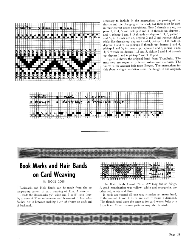 Book Marks and Hair Bands on Card Weaving, Cobb, Eloise. Weaver, Vol. 7 No. 2 (July 1942), 1 page. Note: PDF provided by Judith Combs. Posted September 2, 2006. SAMPLE PAGE. File size 119 KB PDF