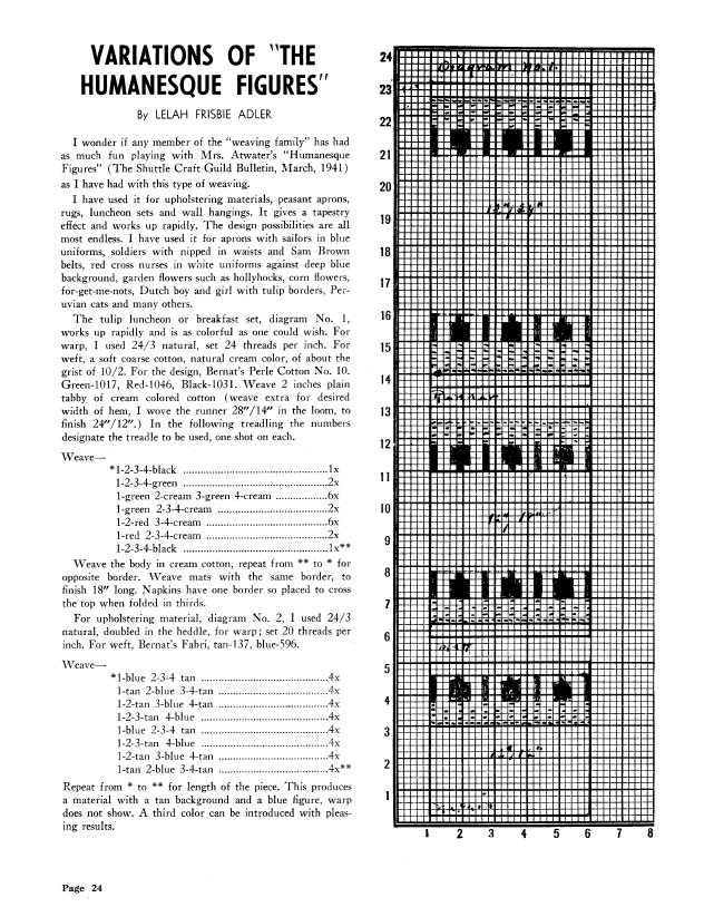 Variations of the Humanesque Figures, Adler, Lelah Frisbie. Weaver, Vol. 7 No. 2 (July 1942), 2 pages. Note: PDF provided by Judith Combs. Posted September 2, 2006. SAMPLE PAGE. File size 237 KB PDF