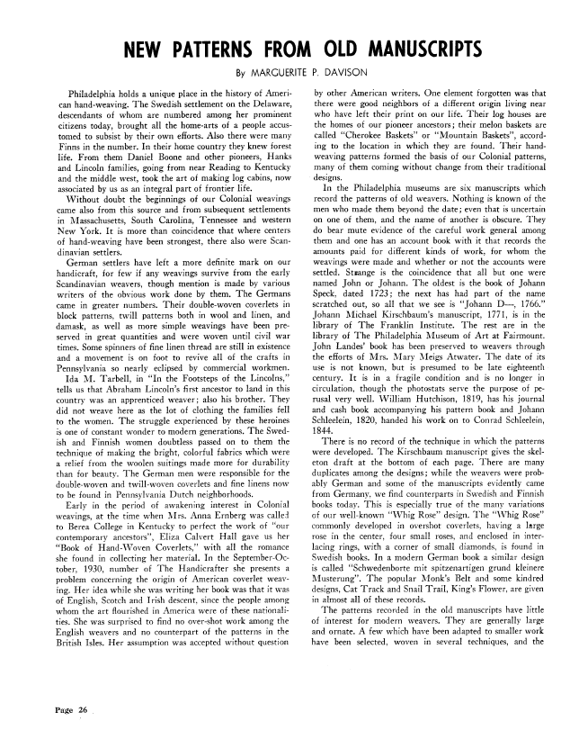 New Patterns from Old Manuscripts, Davison, Marguerite. Weaver, Vol. 7 No. 2 (July 1942), 7 pages. Note: PDF provided by Judith Combs. Posted September 2, 2006. SAMPLE PAGE. File size 470 KB PDF