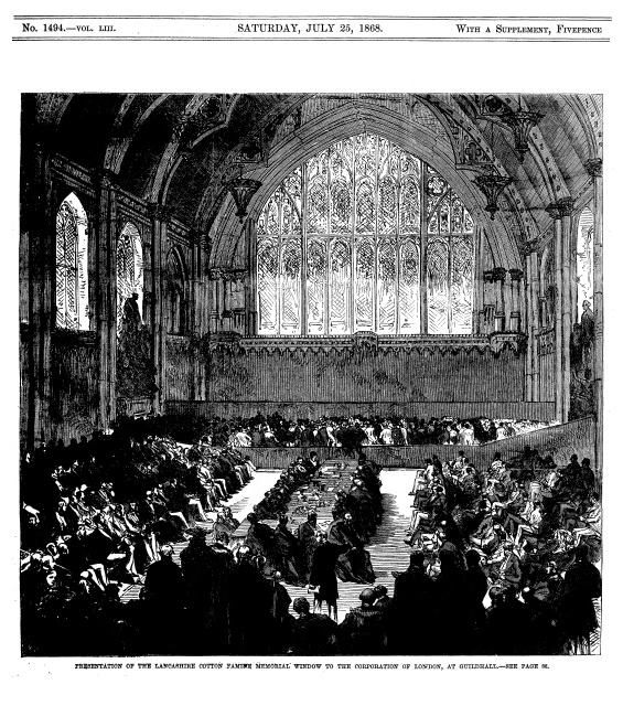 Lancashire Cotton-Famine Memorial Window in Guildhall, ---. Illustrated London News, Vol. 53 (July 25, 1868), 2 pages. Note: Reduced to 80% to fit on page. Posted February 12, 2004. SAMPLE PAGE. File size 1.1 MB PDF