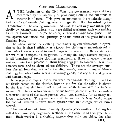 Clothing Manufacture, ---. Workers of the Nation: An Industrial Encyclopedia of the Occupations of the American People, 1906, 2 pages. Posted March 5, 2004. SAMPLE PAGE. File size 480 KB PDF
