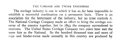 Cordage and Twine Industries, ---. Workers of the Nation: An Industrial Encyclopedia of the Occupations of the American People, 1906, 2 pages. Posted March 5, 2004. SAMPLE PAGE. File size 444 KB PDF