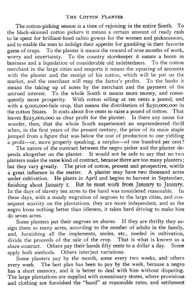 Cotton Planter, ---. Workers of the Nation: An Industrial Encyclopedia of the Occupations of the American People, 1906, 2 pages. Posted March 8, 2004. SAMPLE PAGE. File size 480 KB PDF