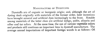 Manufacture of Dyestuffs, ---. Workers of the Nation: An Industrial Encyclopedia of the Occupations of the American People, 1906, 2 pages. Posted March 5, 2004. SAMPLE PAGE. File size 448 KB PDF