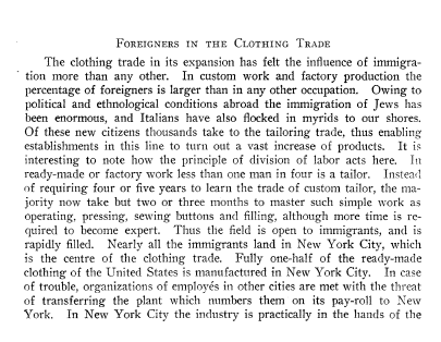Foreigners in the Clothing Trade, ---. Workers of the Nation: An Industrial Encyclopedia of the Occupations of the American People, 1906, 3 pages. Posted March 5, 2004. SAMPLE PAGE. File size 572 KB PDF