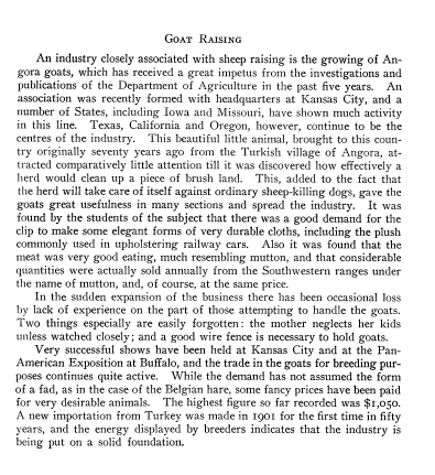 Goat Raising, ---. Workers of the Nation: An Industrial Encyclopedia of the Occupations of the American People, 1906, 1 page. Posted March 8, 2004. SAMPLE PAGE. File size 444 KB PDF