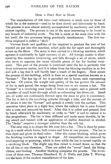 Hats and Caps, ---. Workers of the Nation: An Industrial Encyclopedia of the Occupations of the American People, 1906, 3 pages. Posted March 5, 2004. SAMPLE PAGE. File size 596 KB PDF