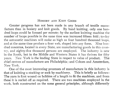 Hosiery and Knit Goods, ---. Workers of the Nation: An Industrial Encyclopedia of the Occupations of the American People, 1906, 2 pages. Posted March 5, 2004. SAMPLE PAGE. File size 488 KB PDF
