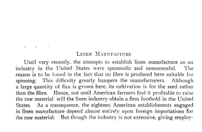 Linen Manufacture, ---. Workers of the Nation: An Industrial Encyclopedia of the Occupations of the American People, 1906, 2 pages. Posted March 5, 2004. SAMPLE PAGE. File size 456 KB PDF