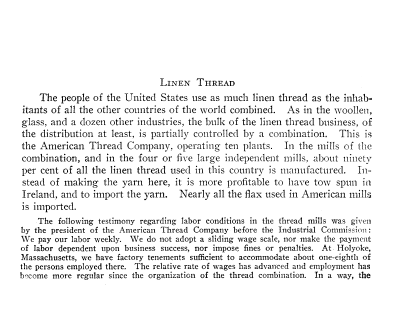 Linen Thread, ---. Workers of the Nation: An Industrial Encyclopedia of the Occupations of the American People, 1906, 2 pages. Posted March 5, 2004. SAMPLE PAGE. File size 484 KB PDF