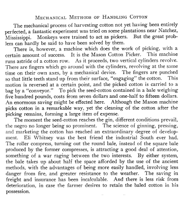 Mechanical Methods of Handling Cotton, ---. Workers of the Nation: An Industrial Encyclopedia of the Occupations of the American People, 1906, 1 page. Posted March 8, 2004. SAMPLE PAGE. File size 440 KB PDF