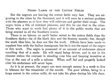 Negro Labor in the Cotton Fields, ---. Workers of the Nation: An Industrial Encyclopedia of the Occupations of the American People, 1906, 1 page. Posted March 8, 2004. SAMPLE PAGE. File size 420 KB PDF