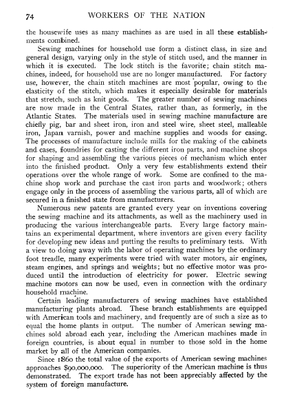 Manufacture of Sewing Machines, ---. Workers of the Nation: An Industrial Encyclopedia of the Occupations of the American People, 1906, 3 pages. Posted March 5, 2004. SAMPLE PAGE. File size 568 KB PDF
