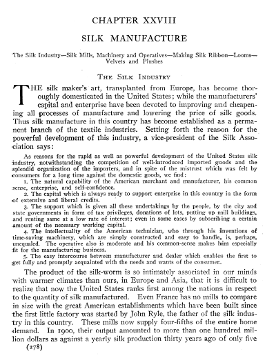Silk Manufacture, ---. Workers of the Nation: An Industrial Encyclopedia of the Occupations of the American People, 1906, 5 pages. Posted August 12, 2003. SAMPLE PAGE. File size 814 KB PDF