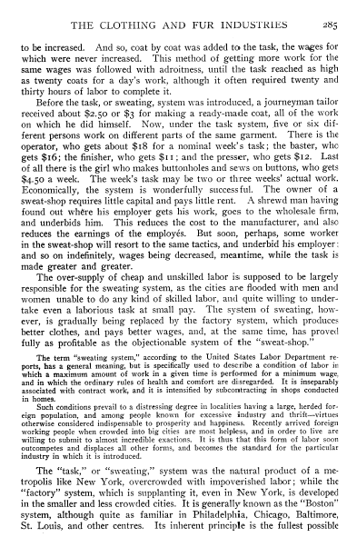 "Sweating," Home and Factory System, ---. Workers of the Nation: An Industrial Encyclopedia of the Occupations of the American People, 1906, 3 pages. Posted March 5, 2004. SAMPLE PAGE. File size 560 MB PDF